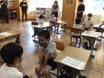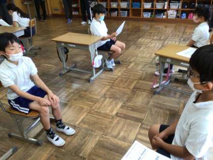 3年生の教室では、来週から始まる名人タイムに向けて、講師の先生が教えに来てくださいました。「目が覚めて大人になっていたらどうする?」の問いに、「体は大人でも心は子供だから小学校に通う」「本当に大人になっているか、難しい計算して確かめる」「体に影響はないかみる」など、疑うものから、「夢かもしれないからもう一度寝る」「車の免許をとる」「大人を楽しむ」という大物ぶりを表す意見もありました。伝え名人、聴き名人のめあてができた数、シールをもらいました。