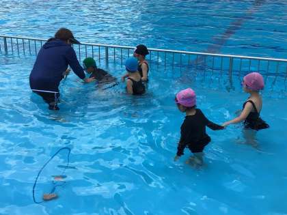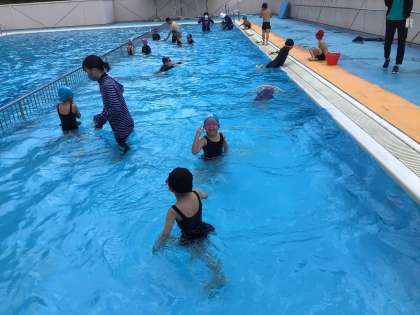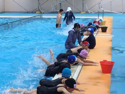 体操もシャワーもやり方をすぐに身につけた子供たち。今日は講師の石崎先生と一緒に、輪くぐりやバタ足の練習をしました。一年生の子供たちは、石崎先生に「かっこいい!」と声をかけていたそうです。