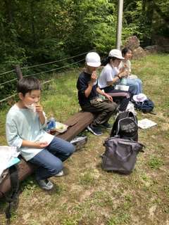 広いキャンプ場、みんなの後を追って見つけるのは大変か!と、思っていましたが、辺りに響く大きな声の方へ行くと、やはり幸海っ子でした。とにかく元気!早々と愛情弁当をほおばっていました。