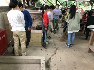 ファイヤーが組まれていた場所を進んで掃き掃除するすがたも。