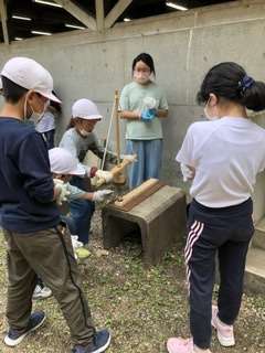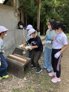 火起こしに奮闘中。消えては着き、着いては消えて。お互いに励まし合って、声をかけ合って、力を合わせたからこそ、生まれた火です。