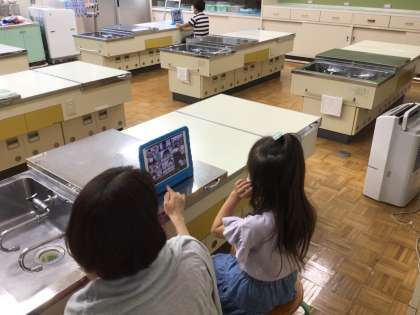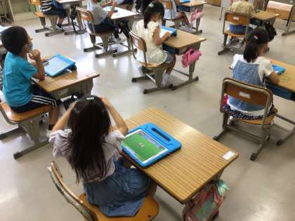 タブレットを使って、初めてのオンライン授業の練習をしました。