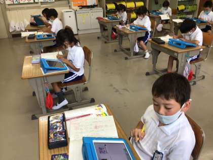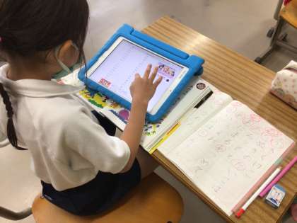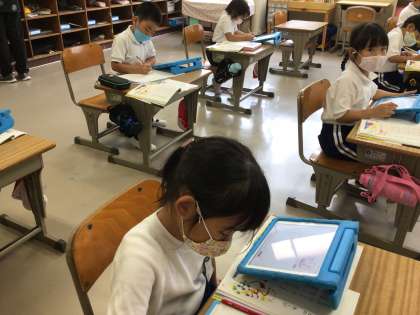 一年生が学習タブレットで調べ学習をしています。「ありさん、あいさつ、あいうえお」というひらがな遊び歌をオリジナルで作っている真っ最中でした。「は」がくっつく言葉を2語分3語分で探して、リズムよく組み合わせて作ります。しりとり文字ばかりをあつめている辞書のようなアプリなので、子供たちにとって分かりやすい調べ方です。作り終えたところで、学び合い。お互いの作品を発表しました。