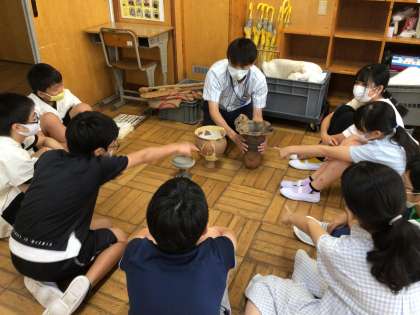 6年生の子供たちは、これまで学んだことを生かしながら、縄文と弥生の時代の服装を比べたり、土器の特徴を見つけたりしました。黒曜石をナイフがわりにもできましたね。本物の土器なので、片手ではなく、両手でしっかりと持つようにしました。ひやひやしました。