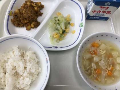 今日は豆入りのドライカレーを麦ご飯にかけて食べました。スープにはアルファベットのマカロニが入っていました。
