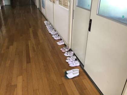 プール前の廊下、1、2年生のシューズが丁寧に並んでいました。