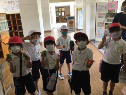 手には収穫した野菜。こんな大きさのカボチャができてるよ。すいかもこのくらいだよ。このピーマン、いいにおいがするよ。と、一斉に教えにきてくれます。毎日、水やりしているものね。うれしいね。どんなふうにしておうちで食べたのかな。