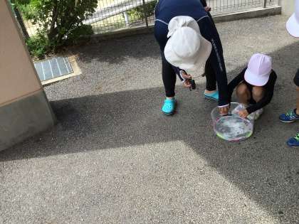 プールの授業の後、水着のままで、シャボン玉作りをしました。