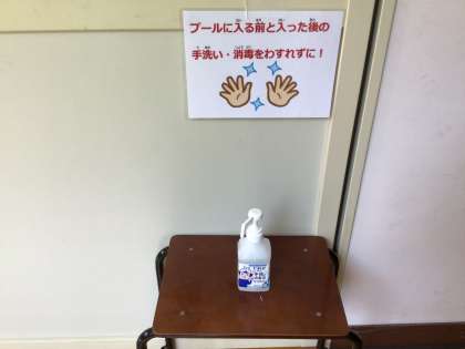 コロナ感染も徐々に広がってきているので、プールの出入り口には、手指の消毒のコーナーを設けています。