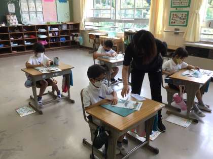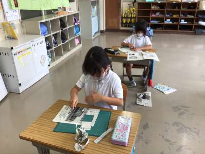 カッターナイフと定規を使って、窓を作っていました。どんなふうに切り込みを入れると、どんなふうに開くのかな。計画がどんどん湧いてくるね。