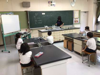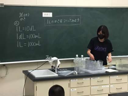 理科室で、実際にマスなど使って水を量り、量の学習をしました。