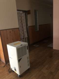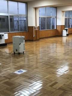 幸海小は立地により、かなりの湿度の高さがあります。昨年度、学校づくりによる天井換気扇の清掃、空気の流れを作る扇風機の設置等により、今年は3年生前トイレ付近に床の結露が起こらず、安全に歩くことができています。新たに業務用除湿器を2台購入し、夜間に稼働させています。