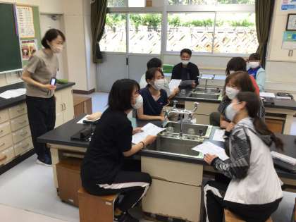 教務主任の先生が講師となって、英語の授業の進め方を学びました。ペアやグループで会話をして学びました。