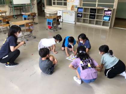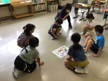 学活で、夏休み思いで双六をやりました。双六で止まったところの指示で思い出を話しました。