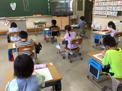 1年生の教室では集中して、ひらがなの練習をしていました。とても形よく文字が書けているので、夏休みもおうちの人と一緒に練習をしたのでしょうね。