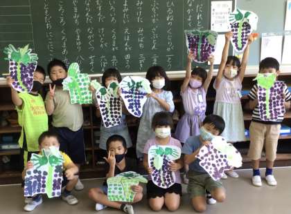 黒板にブドウの絵があるので、尋ねてみると、図工で作品を作ったとのこと。みんなでせえの!って見せてくれました。素敵!