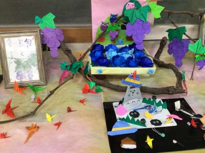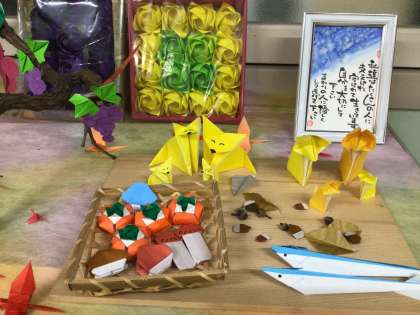 公務手さんの折り紙と心の相談員さんのおのれ書の素敵な秋のコラボです。心の相談員さんからの心温まるメッセージ、いいですね。