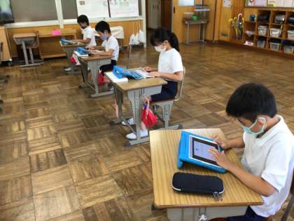 3年生は道徳の授業が終わったところでした。タブレットを使って、ローマ字練習をしていました。継続は力になります。