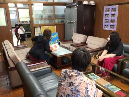 学年の代表の子が校長室までお迎えに来ます。後ろから一年生の子に言葉を教えてあげている4年生。優しいね。