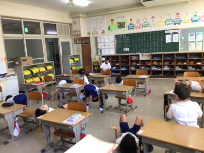 一年生は国語で漢字のはなしの学習をしました。漢字の成り立ちの初めの一歩です。山や川、口や目、は見た目からできていますね。上や下は、子供たちが言うには、こうやって逆さになると、同じに見えるそうです。おもしろい発想ですね。次々とポーズを変えて見始める子供たちでした。