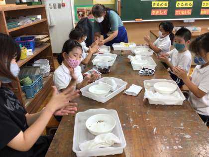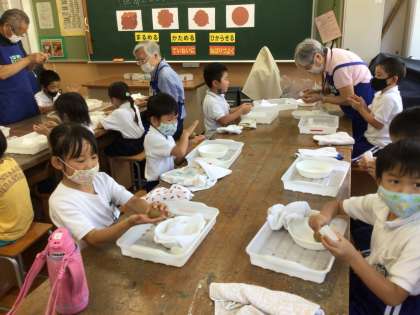 今日は、ものづくりサポーターの皆さんが、学校まで土だんごの作り方を教えに来てくださいました。粘土質の土をひたすら丸めて、ころころと転がし続ける子供たちでした。