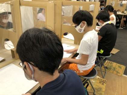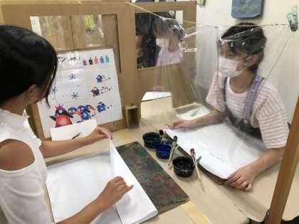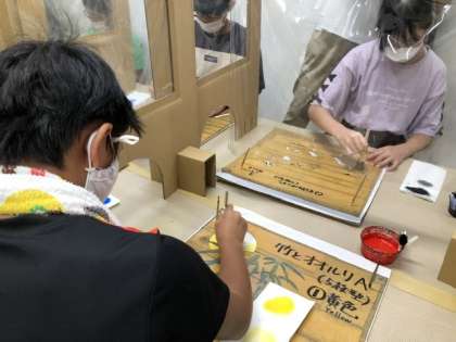 友禅染の体験。戸惑いながらも、最後には素敵な作品が完成。お楽しみに。