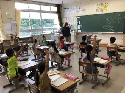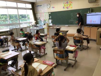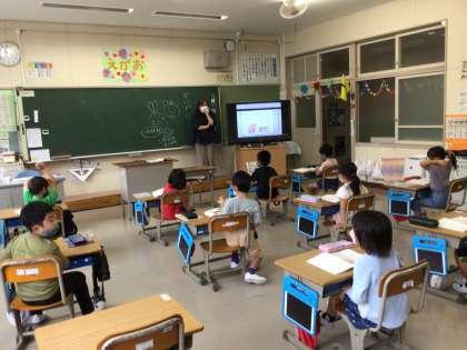 1年生は新しいお話「かいがら」の学習中でした。登場人物のくまのこ、うさぎのこの気持ちを会話文や行動をもとに読み取っていきます。楽しみながらお話の世界に浸っていることが伝わってきます。