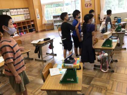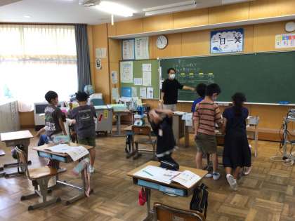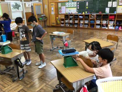 3年生は算数の重さの学習中でした。大きな数になればなるほど、量感が捉えづらくなります。みんなで教室中のものを見当付けながら集め、はかりで1kgになるように調整していました。先生が結果を黒板に書き込むたびに、歓声と落胆の声があがりました。体験的な活動のよさを感じます。