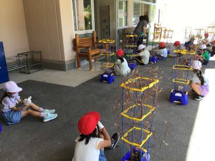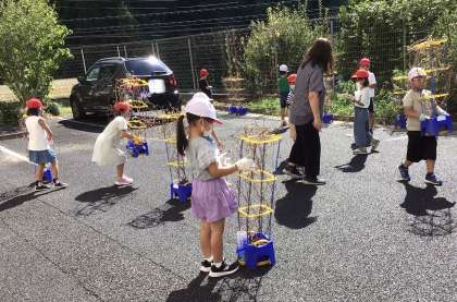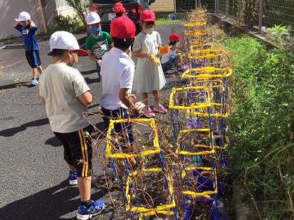 春から夏休みの間もずっと育ててきたアサガオ。今日はアサガオの植木鉢の前にみんな集合。軍手をはめて、よいしょと日陰に移動させます。