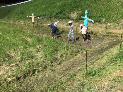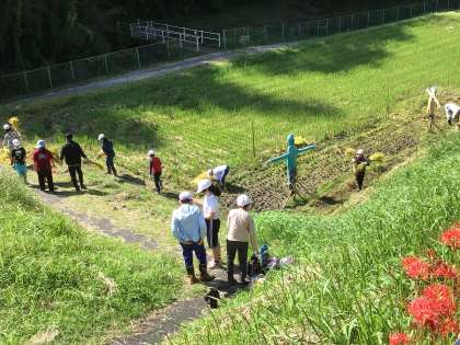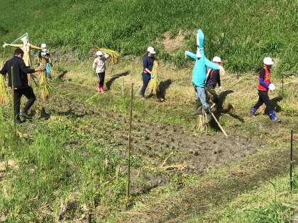 作業も終わりに差し掛かった頃、田んぼの中で探し回っている子たちがいました。「はだしのゲンがいたら、あげたいなあ」と言う声も聞こえてきました。一粒のお米も大切にしよう、稲穂を拾っていたのでした。子供たちの姿が嬉しかったです。