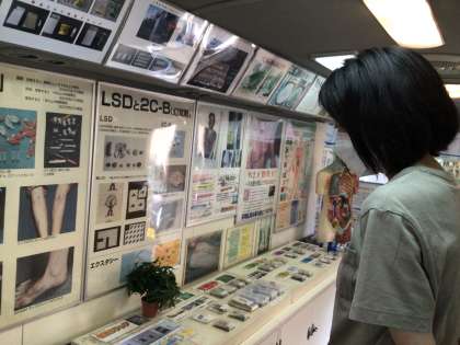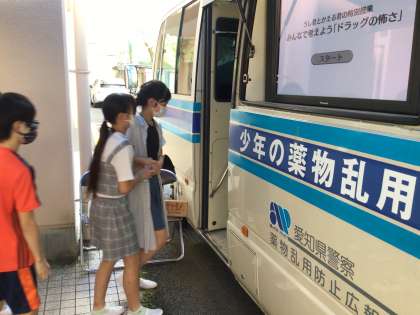 薬物乱用防止教室で、薬物に関する資料が掲示された広報車の中を見ました。