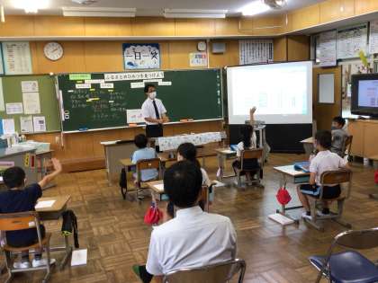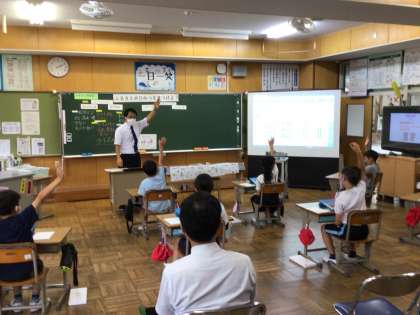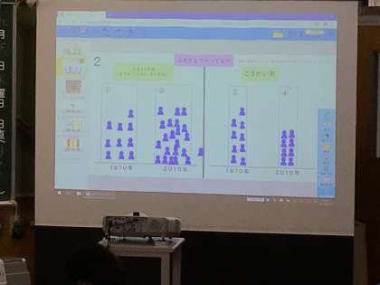 校区の地域の人口の絵グラフをタブレットを使って、協働して完成させました。グラフを見て、変化した理由を話し合いました。