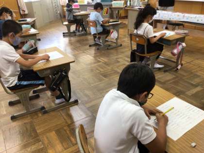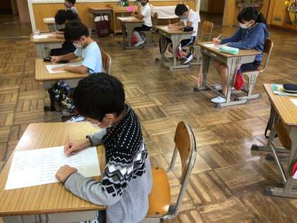 テストの問題をじっと見つめながら、チャレンジする子供たちでした。テストには本番と書いてあったので、先生があらかじめ練習プリントを出してくれたのかな。作文の中で漢字が使えるようになるといいね。