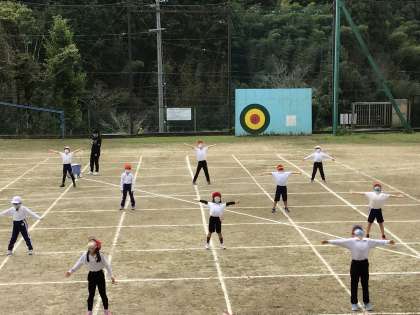 運動場ではラジオ体操をしています。運動会では、開会式で行います。がんばれ!