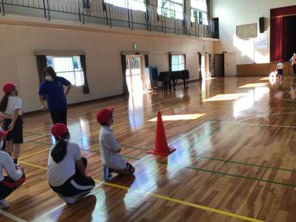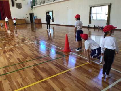 運動会のリレー練習では、6年生が一年生に並ぶ順番や並び方を教えてあげたり、ラジオ体操の見本になって向かい合いの反対の動きに挑戦したり、頼もしい姿が至るところで見られます。下学年も頑張っています。