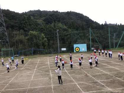 先生たちがほんの5分ほどで見事にライン引きや器具など準備した玉入れ。