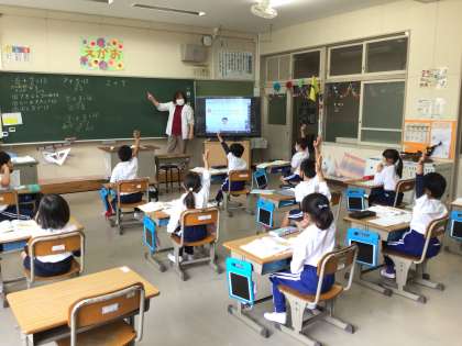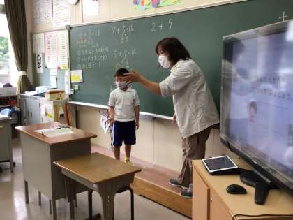 一年生から大きな拍手が聞こえます。教室をのぞくと、算数の最中でした。子供たちが口々にもっとやりたい、難しい問題もやりたいと盛り上がっているのです。一桁の繰り上がりのあるたし算です。さくらんぼに分けて、10の束にして、残りを合わせます。