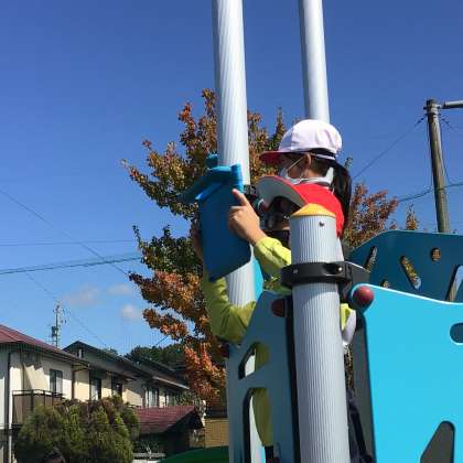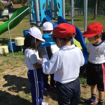 2年生は学校近くの3つの公園に行き、町のよさを見つけました。秋の実を拾ったり、虫を捕まえたり、遊具で遊んだり。思い思いの発見を学習タブレットで写真に撮って記録しました。