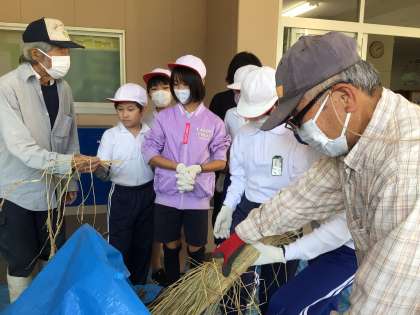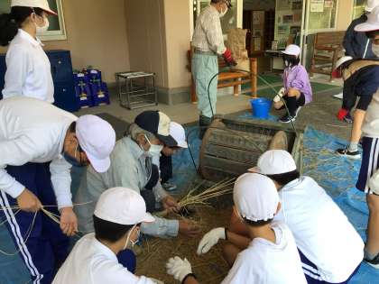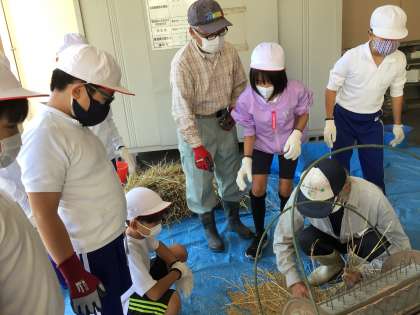 今日は先日稲刈りをした稲を脱穀する日でした。講師の清水さんが寄付してくださった脱穀機にみんな夢中。もっと踏み込んで!と声をかけられながら作業しました。