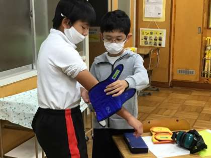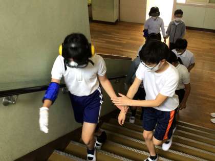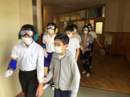 6年生は高齢者疑似体験を行いました。今回は社会福祉協議会より体験グッズを貸していただき、白内障になった場合の見え方、足や腕におもりをつけたり、手袋をつけたりして、階段や狭い廊下を歩きました。