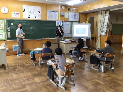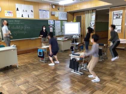 4年生の教室から音楽が聞こえてきます。今日は、ブライアン先生と教務主任の先生と一緒に英語の学習がありました。アルファベットに合わせて、しゃがんだり、ジャンプしたり、とっても楽しそうです。ひとしきり終わった後、子供からは「これは体育だ」と言う感想がありました。楽しい工夫でアルファベットの形がよくわかったね。