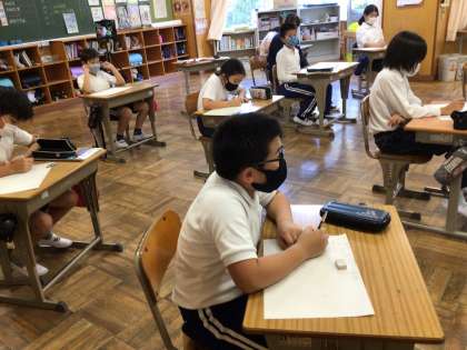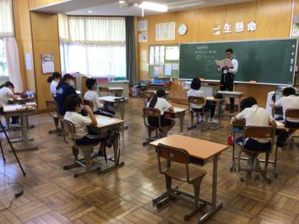 読書感想画のお話を聞いて、印象的な場面を見つける子供たち。真剣に耳を傾けます。題名はよだかの星です。