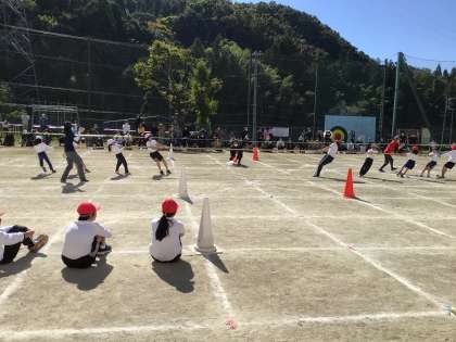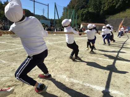 全校で、力一杯、綱を引きました。2-1で、赤が勝ちました。