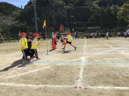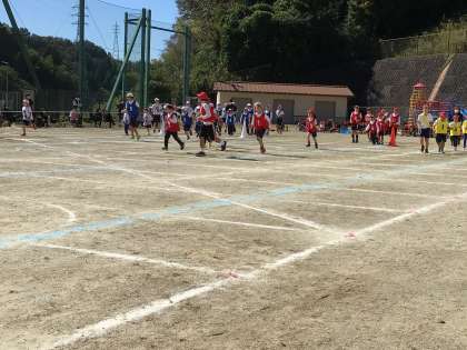 全校でリングをつなぎました。1位 赤、2位黄、3位青、4位白でした。