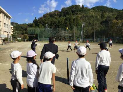 写真は5年生の学習タブレットを使った授業。子供たちの手慣れた作業の様子を見て感心してみえました。運動場では3、4年生の子供たちがTバットでゲームをしていました。急きょ参加で、子供たちが見つめる中、見事ヒット!ランナーがホームに戻って一点追加となりました。みんな大喜び。さちのみでは、一年生がうまく挨拶できるように一生懸命にフォローする6年生。優しいね。