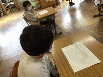 まだ護岸工事がなされる前のお話です。鮎が足にぶつかってくるくらい泳いでいたこと、うなぎを捕まえる仕掛けを作って取ったこと、水車小屋があって水を止めたりして遊んだこと、学校帰りは川の中を歩いて帰ったこと、高学年の子は矢並の方の川で遊んだこと、汲み取りの桶を川で洗うと魚が寄ってきたことなど、身振り手振りで話してくださいました。川遊びのわくわくがとっても伝わってきました。絵地図はわざわざ子供達のために手作りで描いてくださったものです。もっともっと聴きたかったです。本当にありがとうございました。お話の間、担任の先生がタブレットで聞き慣れない事柄の情報を映して子供たちの理解を助けました。
