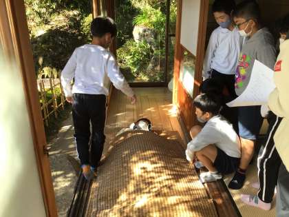鬼頭邸では、さまざまな体験を準備してくださっていました。わらを使った生活必需品としてのわらじ。2種類のわらじを見せていただきました。また、あちこちのお知り合いに声掛けをして集めてくださったむしろ。かつては寝具として利用されていたと聞き、早速、かけむしろ?をして寝心地を確かめる子供たちでした。