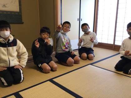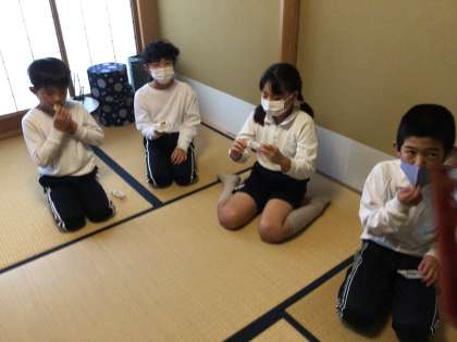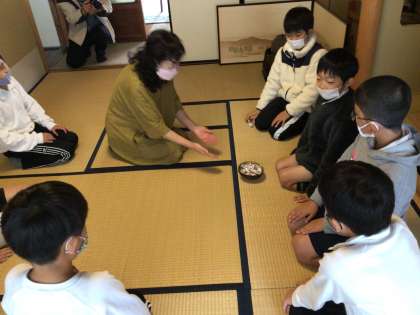 畳のヘリを踏まずに正座をし、お辞儀をしながらお菓子を順番に回していきます。少々緊張気味の子供たちでしたが、美味しそうにもぐもぐとお菓子をほおばり、とってもうれしそう。
