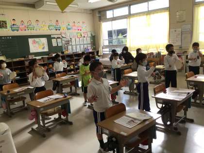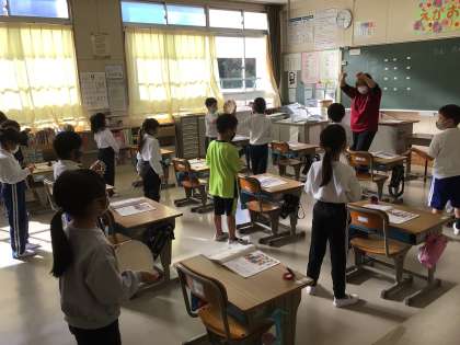 1年生の子供たちは、タンバリン、鈴、トライアングル、カスタネット、それぞれ手に楽器を持って、リズム遊びをしていました。最後までうまくできると、繰り返し演奏ができるようでした。ちびっ子オーケストラのようでしたよ。