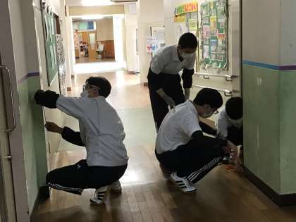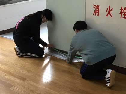 壁のはがれを取りながら作業をする学生さん。様子を見ていた子供たちは、サプライズを用意していました。